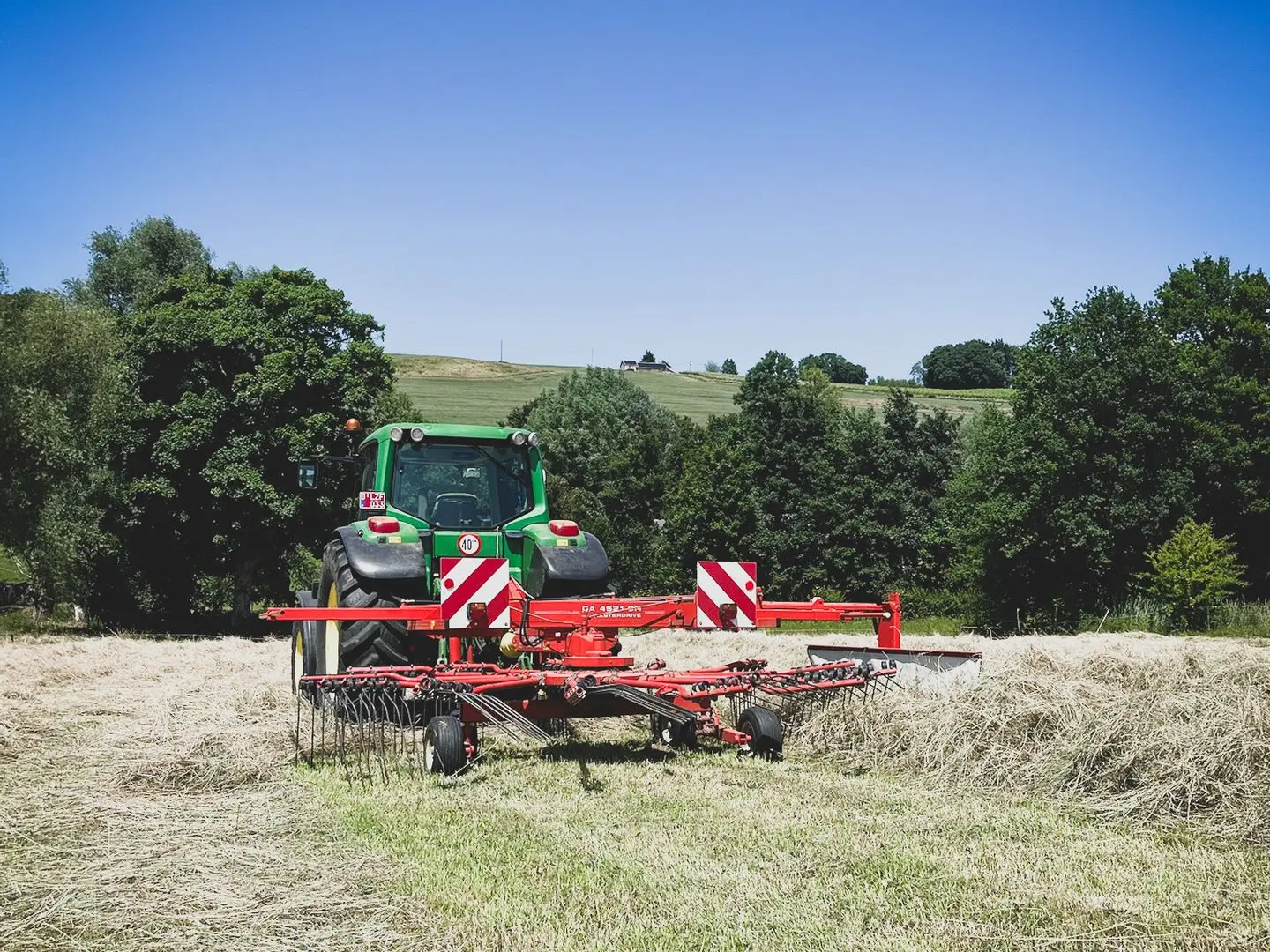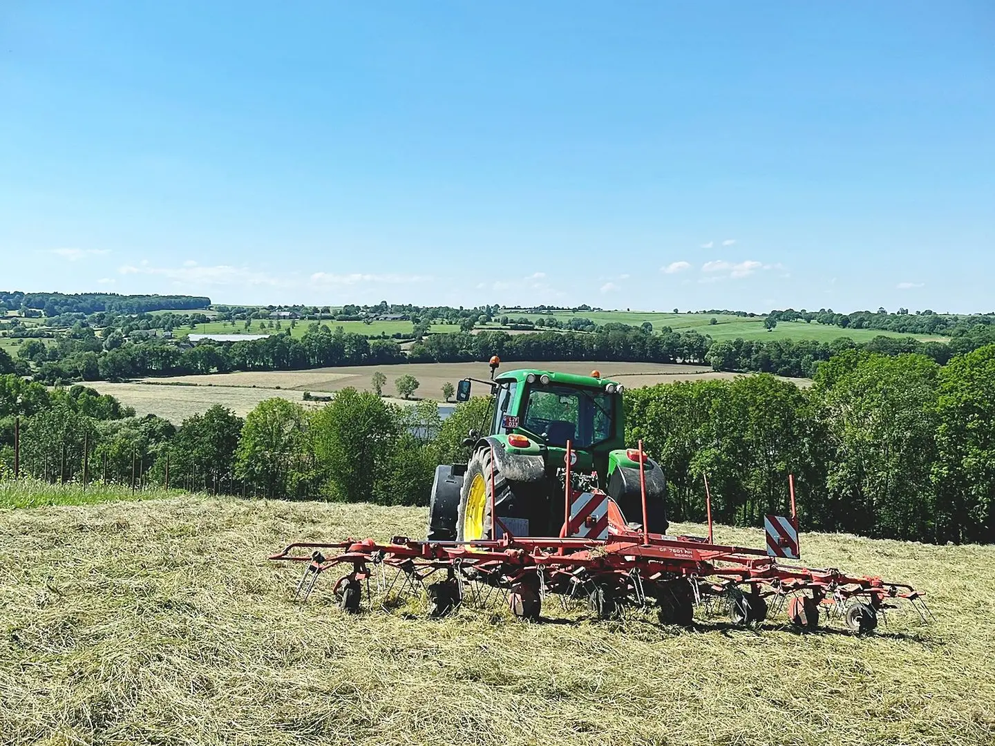 Nous intervenons rapidement après le fauchage pour retourner l’herbe et favoriser un séchage homogène, tout en préservant les feuilles et les éléments nutritifs.